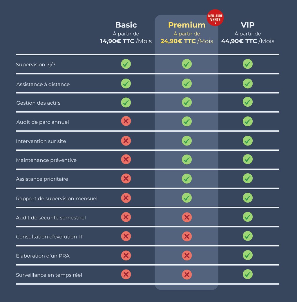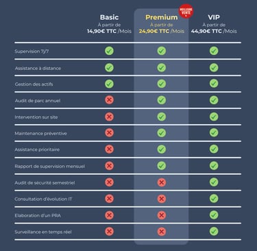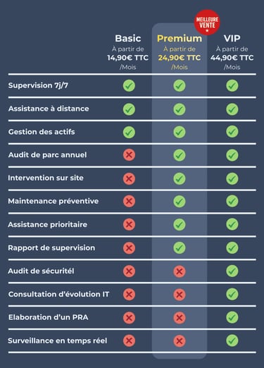 L’offre Premium propose un accompagnement renforcé et proactif. En plus des services de base, elle intègre un audit de parc annuel, des interventions sur site, de la maintenance préventive, une assistance prioritaire ainsi qu’un rapport de supervision mensuel. Cette offre permet d’anticiper les problèmes, d’optimiser le parc informatique et d’améliorer significativement la continuité de service.